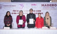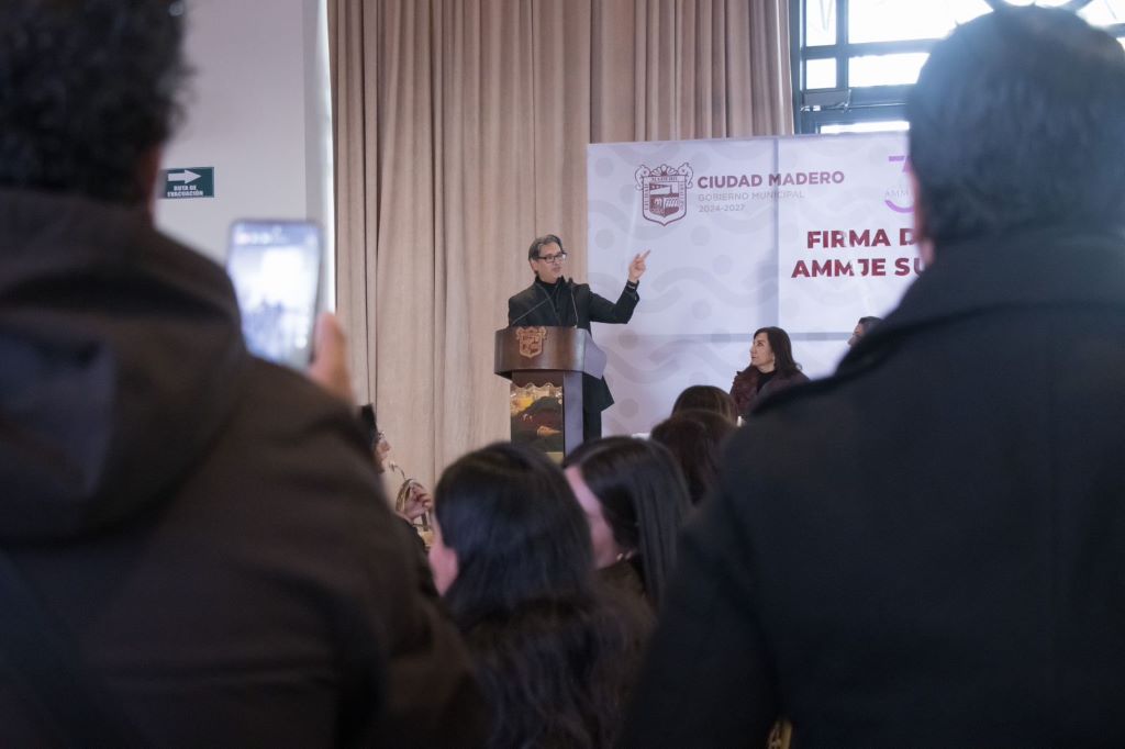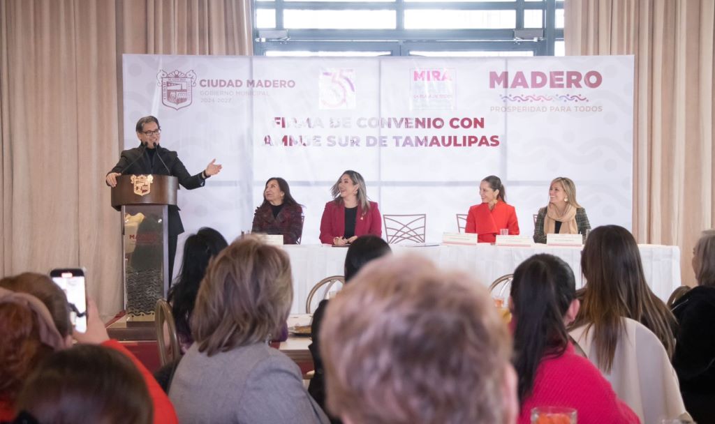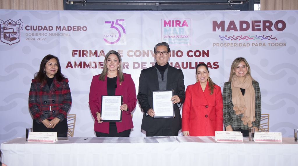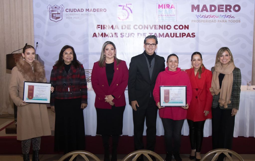 El presidente municipal Erasmo González Robledo, comprometido a impulsar el progreso económico de Ciudad Madero, formalizó un acuerdo de colaboración con la Asociación Mexicana de Mujeres Jefas de Empresa (AMMJE), liderada por Lorena Karely Rivera Ortiz, en el sur de Tamaulipas; este convenio tiene como objetivo fortalecer la relación empresarial con el Gobierno Municipal, fomentar el liderazgo femenino y apoyar el empoderamiento económico y social de las mujeres en nuestra comunidad.