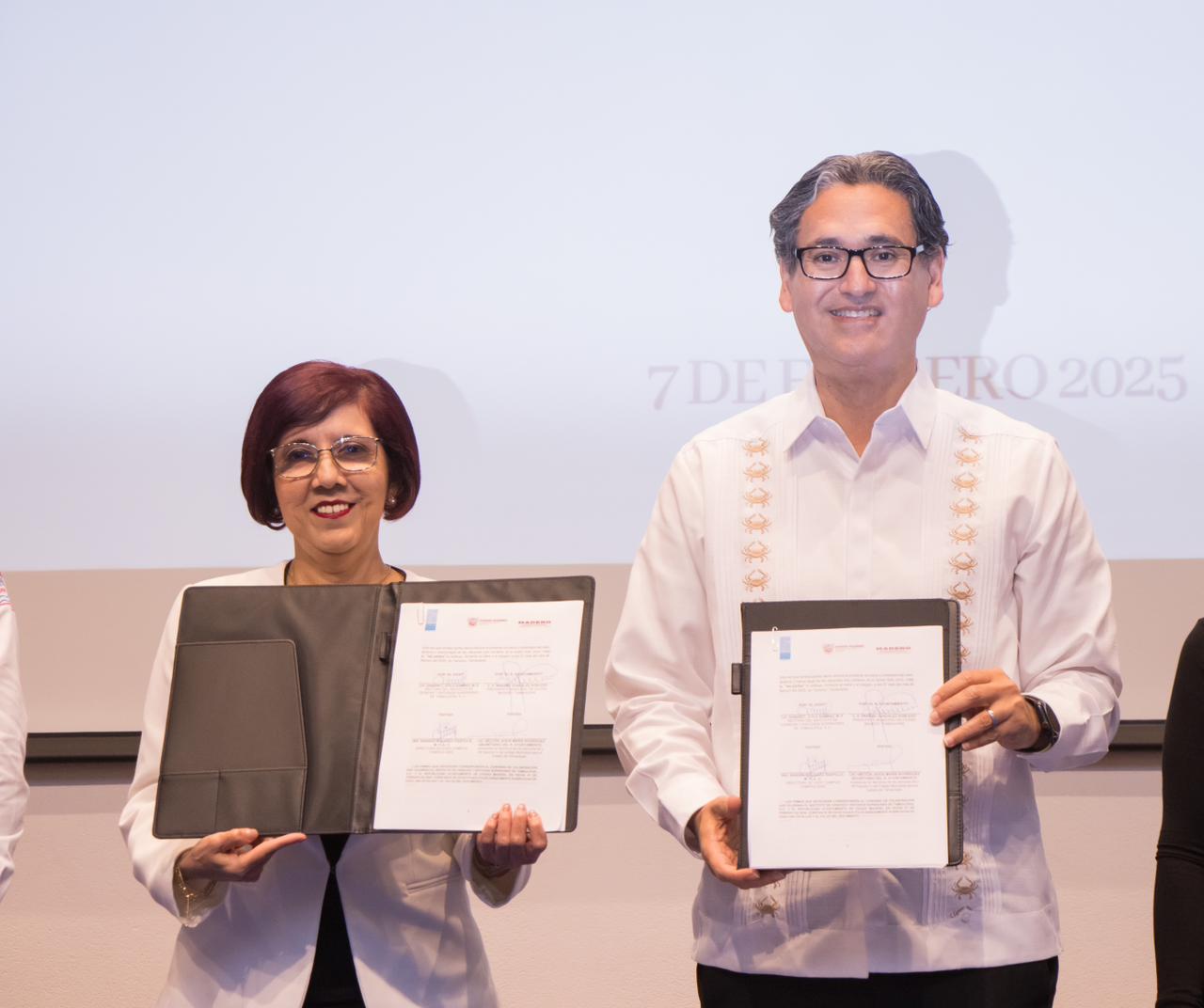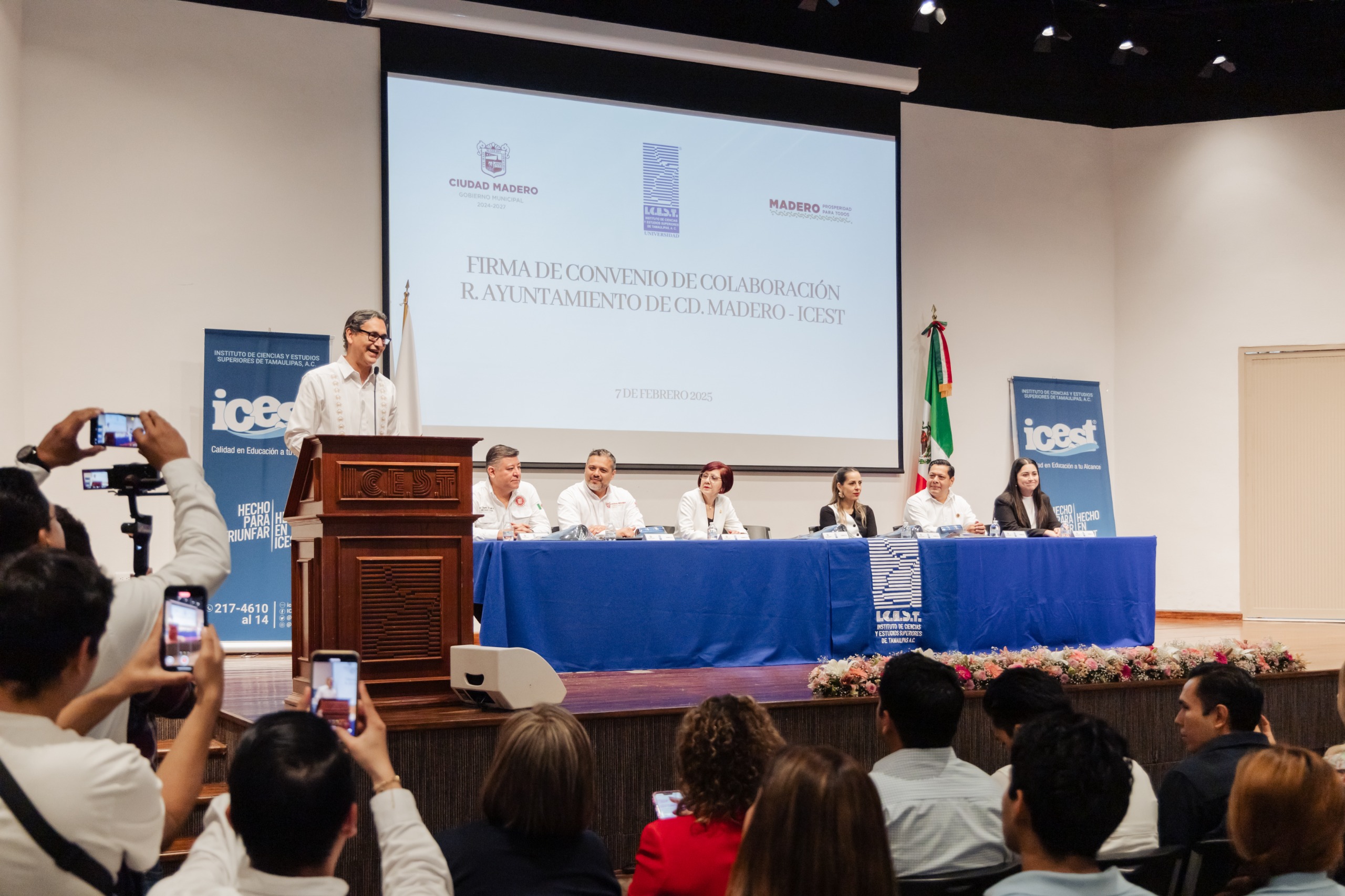 En la firma de convenio estuvieron los diputados del Congreso local Claudio de Leija Hinojosa y Adrián Cruz Martínez; Lic. Héctor Marín Rodríguez, secretario de la comuna maderense; Sandra Inguanzo Castillo, directora del ICEST Campus Tampico 2000; Lic. Lilia Alicia Hernández Pacheco, directora de la Escuela Primaria y Secundaria Pedro de Gante; además de los síndicos Alicia Lerma Cervantes y Roberto Chávez Gutiérrez.