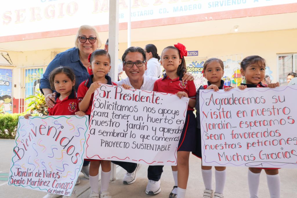 Durante una gira de trabajo por la Ampliación Emiliano Zapata, donde estuvo acompañado por su esposa Dunia Marón Acuña presidenta del sistema DIF, visitó a las y los alumnos Jardín de Niños Federal “Sergio Martínez Cavazos”, donde los recibió la directora del plantel, profesora Araceli Márquez Castillo, y el personal docente. Ahí las niñas y los niños, le plantearon la necesidad de contar con un huerto familiar, en busca de conocer más herramientas del cuidado de las plantas y el medio ambiente.