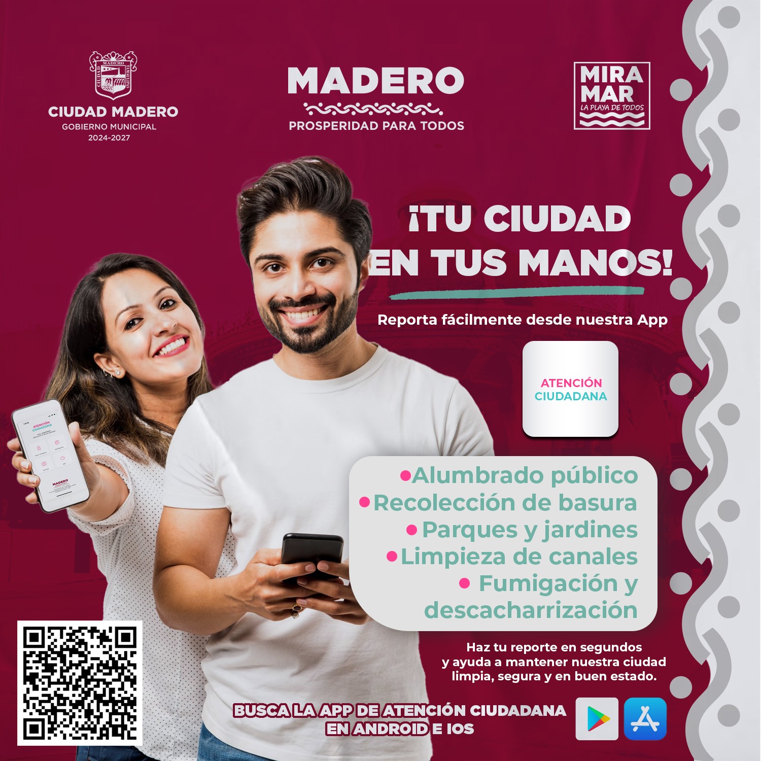 Con el objetivo de promover herramientas digitales que mejoren la eficiencia y rapidez en la atención de servicios públicos, el Gobierno de Ciudad Madero ha lanzado la aplicación móvil “Atención Ciudadana Madero”, disponible en la App Store y Play Store. Esta plataforma permite un contacto directo y facilita el acceso a cuatro módulos de atención relacionados con la recolección de basura, la reposición de lámparas, limpieza de canales y espacios públicos.