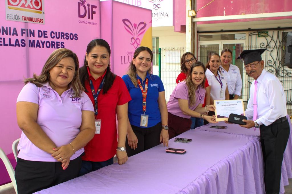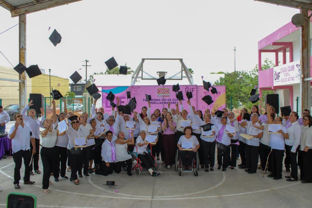 En un emotivo acto celebrado en la Casa Club del Adulto Mayor de la colonia Jesús Luna Luna, el Sistema DIF Ciudad Madero, que encabeza la Lic. Dunia Marón Acuña, llevó a cabo la ceremonia de graduación de 43 adultos mayores que concluyeron el curso de Introducción a la Computación, como parte del programa “Huellas Mayores”, impulsado en conjunto con la empresa OXXO.