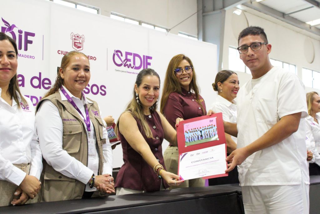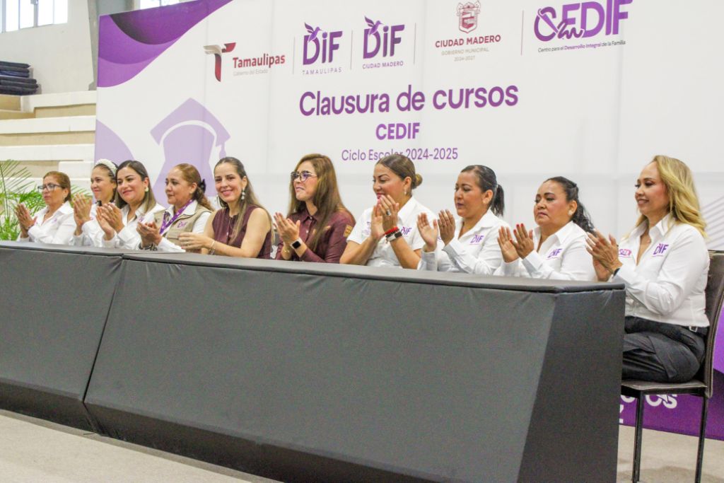 El Sistema DIF Ciudad Madero celebró la ceremonia de clausura de cursos de los Centros de Desarrollo Integral de la Familia (CEDIF), donde se entregaron constancias a 73 estudiantes que finalizaron su formación en talleres de belleza, repostería, corte y confección, así como en auxiliar de enfermería. Este evento fue presidido por la Lic. Dunia Marón Acuña, presidenta del organismo.