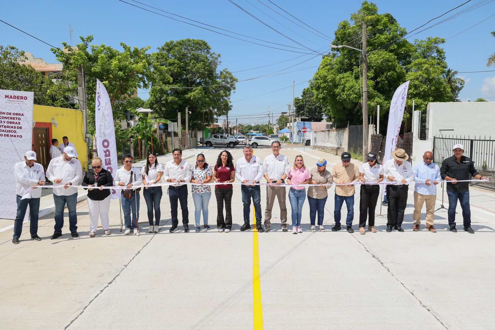 En la colonia Primero de Mayo, se destinaron más de 2.4 millones de pesos para la calle Jalisco (entre República de Cuba y Sonora), que incluyó 87.48 metros lineales de concreto hidráulico.