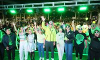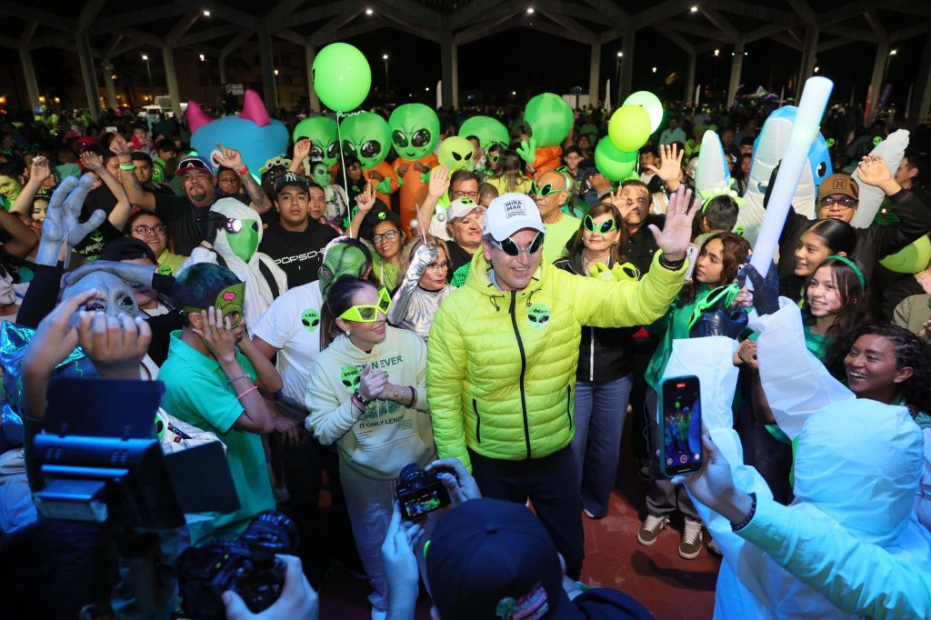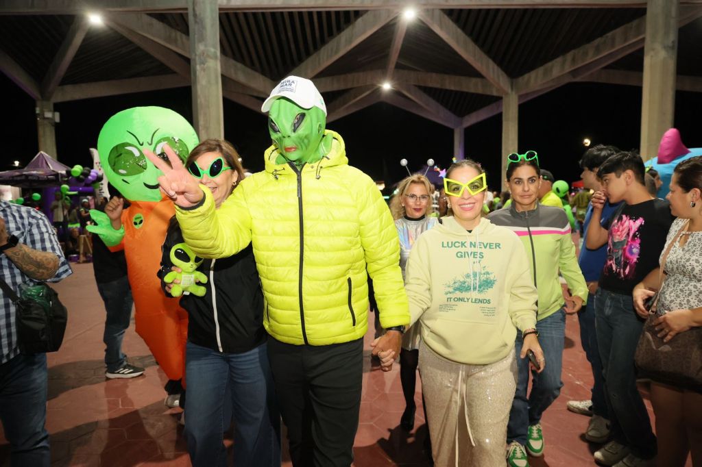El presidente municipal Erasmo González Robledo, acompañado de su esposa Dunia Marón Acuña, presidenta del sistema DIF Madero, y sus hijas Ana Victoria y María Eliza; celebró un cierre espectacular del Marciano Fest 2025 en la playa Miramar en busca de un récord Guinness.
