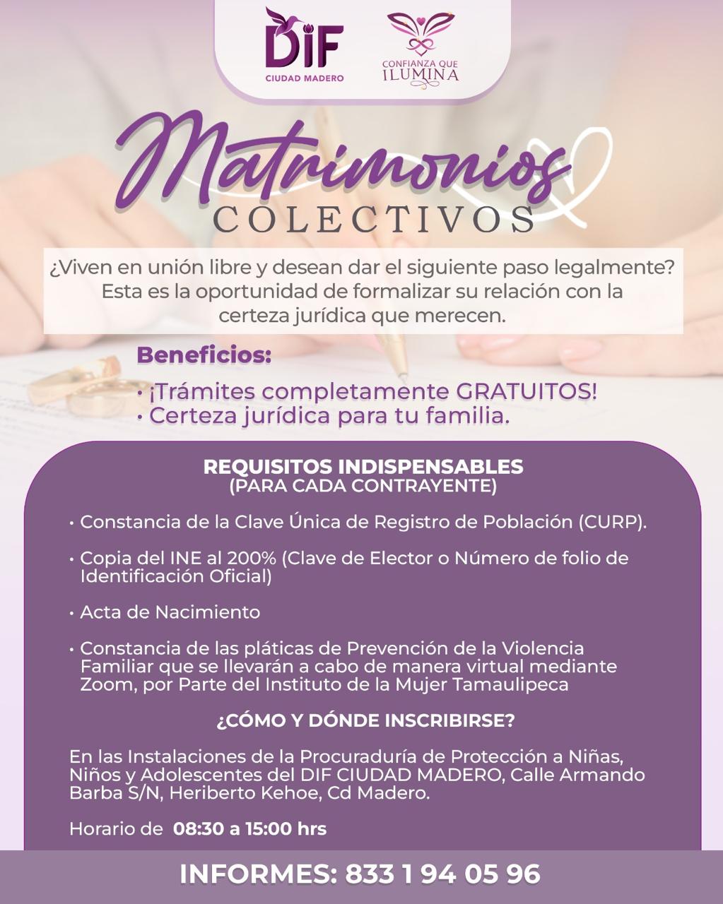 El Sistema DIF Ciudad Madero, que encabeza su Presidenta, Lic. Dunia Marón Acuña, convocó este día a todas las parejas que viven en unión libre a aprovechar la campaña de Matrimonios Colectivos, un programa que brinda la oportunidad de formalizar su relación de manera completamente gratuita y con la certeza jurídica que toda familia merece.