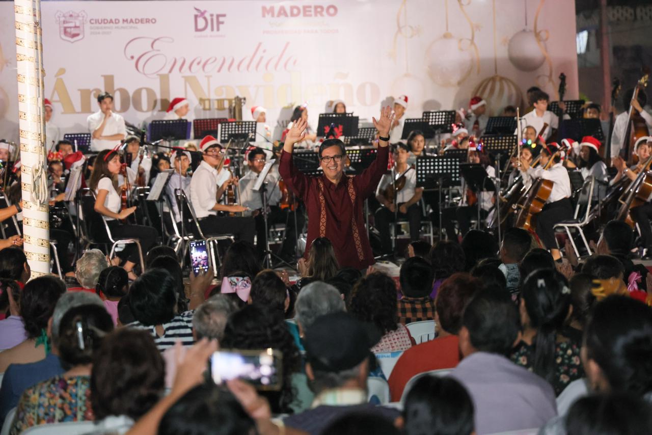 Cientos de familias de Ciudad Madero vivieron la noche del encendido del pino navideño con gran alegría, entusiasmo y un fuerte espíritu de unidad familiar. El evento que fue encabezado por el presidente municipal Erasmo González Robledo, junto a su esposa Dunia Marón Acuña presidenta del sistema DIF; marcó oficialmente el inicio de las festividades decembrinas. Esta celebración resaltó la importancia de la unión y el amor familiar, creando así momentos memorables para todos los asistentes.